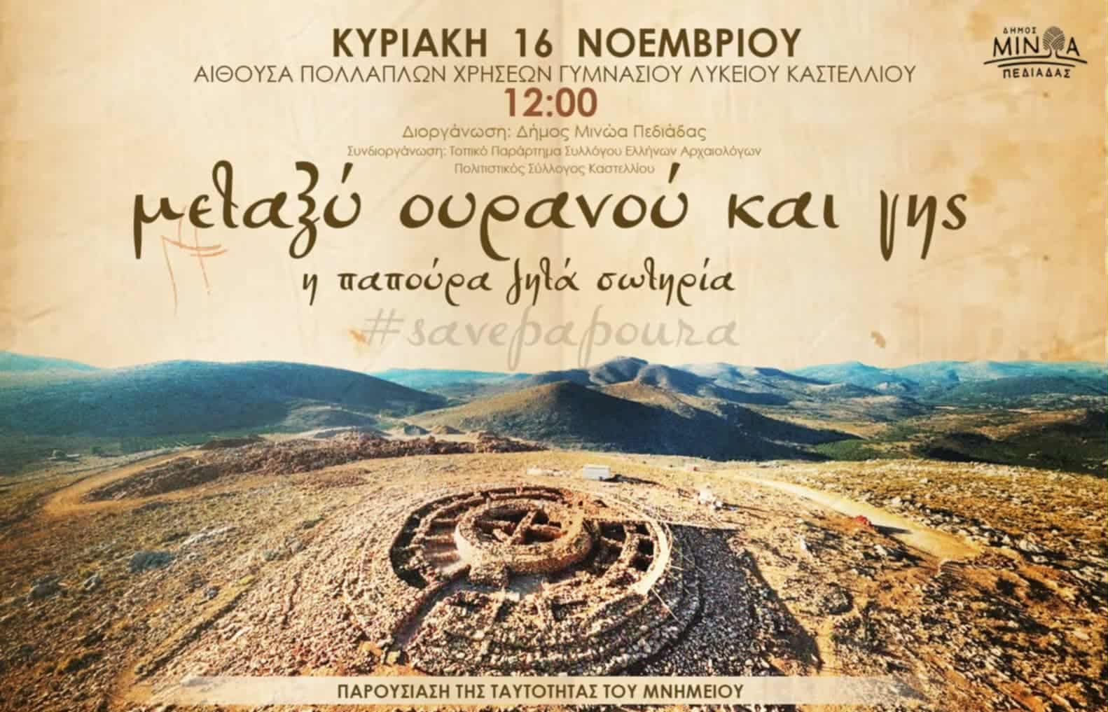 Την Κυριακή 16 Νοεμβρίου στις 12:00 στην αίθουσα πολλαπλών χρήσεων του Γυμνασίου/Λυκείου Καστελλίου ο Δήμος Μινώα Πεδιάδας, σε συνδιοργάνωση με το Τοπικό Παράρτημα Συλλόγου Ελλήνων Αρχαιολόγων και τον Πολιτιστικό Σύλλογο Καστελλίου θα παρουσιάσει την εκδήλωση "Μεταξύ ουρανού και γης, η Παπούρα ζητά σωτηρία" με σκοπό την παρουσίαση του μνημείου.