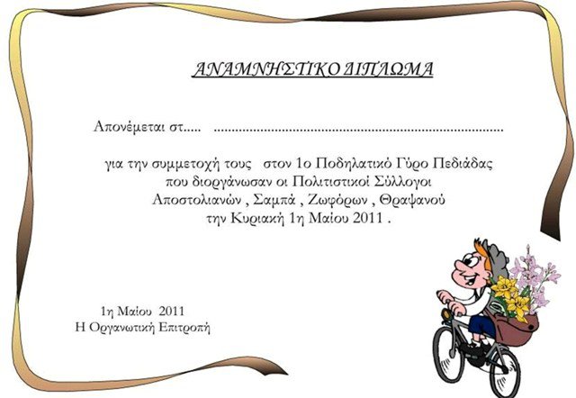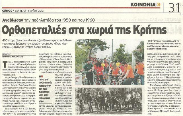 13 Μαϊου 2012 - 2ος Ποδηλατικός Γύρος Πεδιάδας Με επιτυχία πραγματοποιήθηκε στις 13 Μαΐου του 2012 ο «2ος ΠΟΔΗΛΑΤΙΚΟΣ ΓΥΡΟΣ ΠΕΔΙΑΔΑΣ» που οργάνωσαν οι Πολιτιστικοί Σύλλογοι Αποστόλων, Σαμπά, Ζοφόρων και Θραψανού.