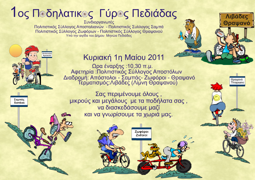 1ος Ποδηλατικός Γύρος ΠεδιάδαςTην Κυριακή 1η Μαΐου 2011 και ώρα 10:30 , πραγματοποιήθηκε ο 1ος Ποδηλατικός Γύρος Πεδιάδας. Η εκδήλωση συνδιοργανώθηκε από τους , Πολιτιστικό Σύλλογο Αποστολιανών Οι Απόστολοι, Πολιτιστικό Σύλλογο Ενεργών Πολιτών Σαμπά, Πολιτιστικό Σύλλογο Ζωφόρων και Πολιτιστικό Σύλλογο Θραψανού, υπό την αιγίδα του Δήμου Μινώα Πεδιάδος, στα πλαίσια της φιλίας, συνεργασίας, αναψυχής των μελών μας και της γνωριμίας με τα χωριά μας χρησιμοποιώντας έναν εναλλακτικό τρόπο μετακίνησης. Η αφετηρία ήταν τα γραφεία του Πολιτιστικού Συλλόγου των Αποστόλων με διαδοχική πορεία προς τα χωριά Σαμπάς , Ζωφόροι , Θραψανό και τερματισμό στην περιοχή Λιβάδες Θραψανού (Λίμνη). Από πλευρας του Πολιτιστικού Συλλογου θα θελαμε να ευχαριστησουμε ιδιαίτερα τους Αποστολιανούς για την μεγαλη συμμετοχή τους στον Ποδηλατικό Γύρο κάθως και όλους όσους βοήθησαν για την πραγματοποίηση του.