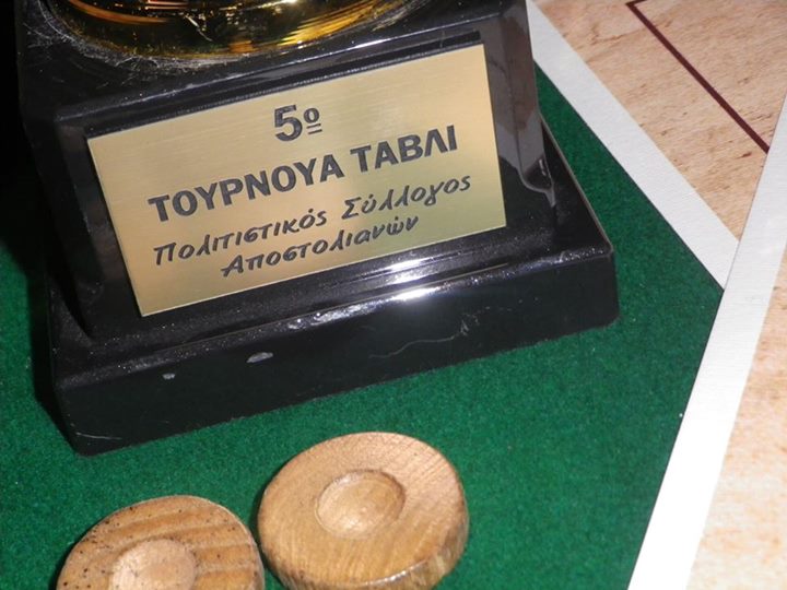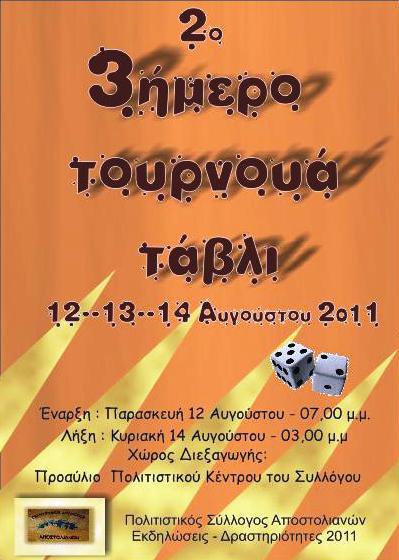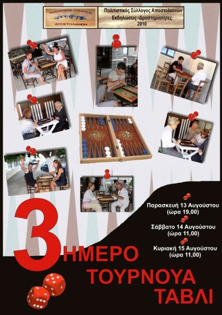 ΤΟΥΡΝΟΥΑ ΤΑΒΛΙ & ΞΕΡΗΣ- ΠΑΡΑΣΚΕΥΗ 10-8-2012 Ο πολιτιστικός Σύλλογος Αποστόλων διοργάνωσε το 3ο τουρνουά Τάβλι και 1ο τουρνούα Ξερής από την Παρασκευή 10 Αυγούστου 2012 μέχρι την Κυριακή 12 Αυγούστου 2012. Ο χώρος διεξαγωγής ήταν στο προαύλιο του Πολιτιστικόυ Συλλόγου. Η συμμετοχή και στα δυο τουρνουά ήταν μεγάλη και στεύθηκαν με απόλυτη επιτυχία!!