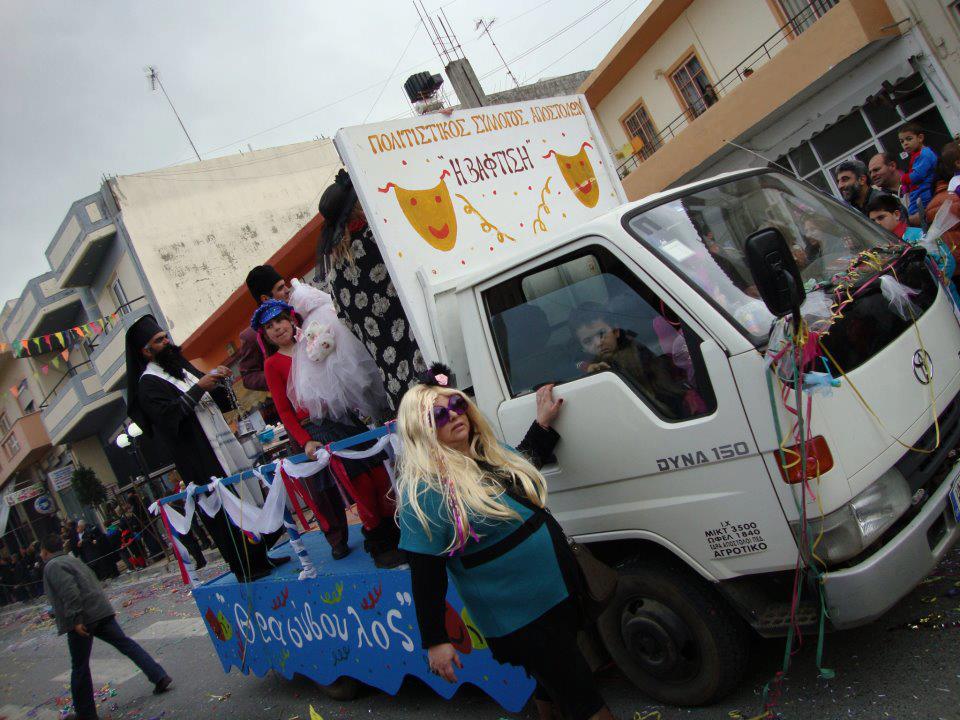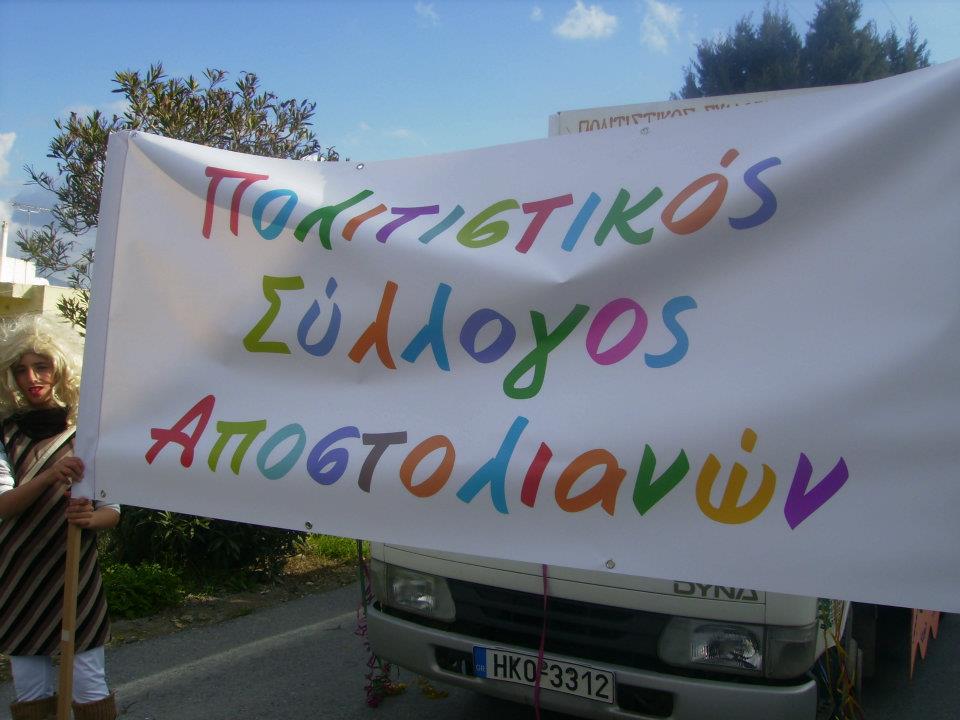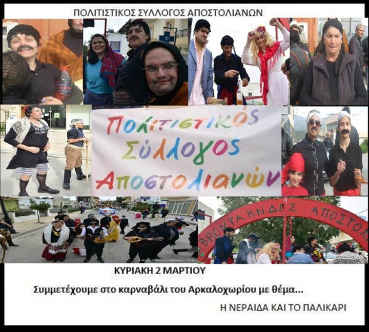 Συμμετοχή στο καρναβάλι του Δ . Μινώα Ο πολιτιστικός σύλλογος συμμετείχε στο καρναβάλι του Δ. Μινώα που πραγματοποιήθηκε στο Αρκαλοχώρι με το θέμα " Αποστολιανά επαγγέλματα ζωντανέψτε...!!