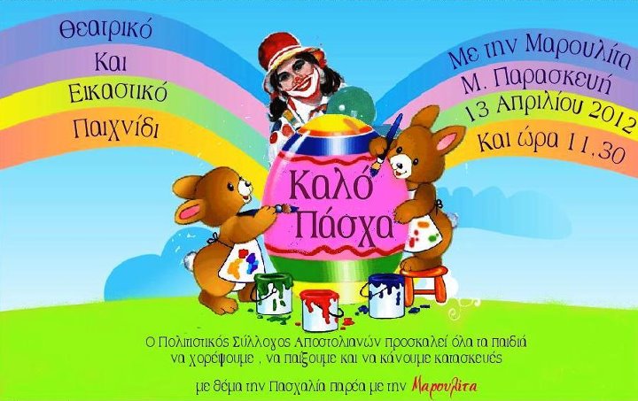 Ευχαριστήρια Επιστολή 13 Απριλίου Θεατρικό παιχνίδι Τη Μ.Παρασκευή 13 Απριλίου πραγματοποιήθηκε για τους μικρούς μας φίλους στο χώρο του συλλόγου θεατρικό παιχνίδι με θέμα τη Πασχαλιά.