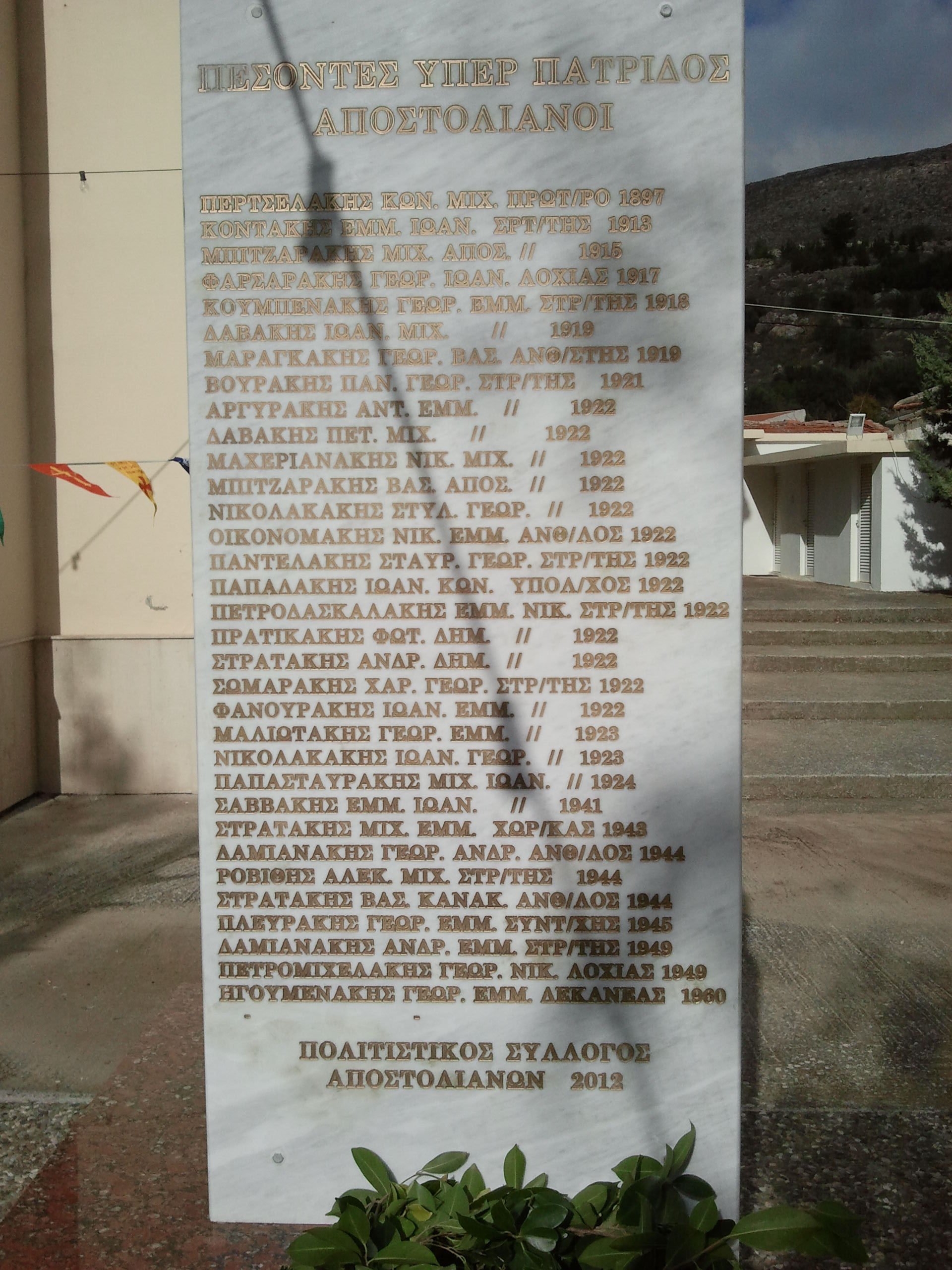 Eκδήλωση μνήμης για τους πεσόντες υπέρ πατριδος Αποστολιανούς Ο Πολιτιστικός Σύλλογος Αποστολιανών πραγματοποίησε την Κυριακή 25 Νοεμβρίου 2012 εκδήλωση μνήμης Ευχαριστήρια επιστολή Αγαπητά μέλη και φίλοι, Σας ευχαριστούμε που ανταποκριθήκατε στην πρόσκληση του Συλλόγου μας και τιμήσατε με την παρουσία σας την εκδήλωση μνήμης για τους πεσόντες υπέρ πατρίδος συγχωριανούς μας. Το χωριό μας έχει πληρώσει βαρύ φόρο αίματος στους απελευθερωτικούς αγώνες της πατρίδας μας, αλλά και στην Μικρασιατική καταστροφή από την οποία φέτος συμπληρώνονται 90 χρόνια. Ο κ. Νίκος Μανώλα Ηγουμενάκης πρότεινε στο ΔΣ του Συλλόγου μας να αναλάβει ο ίδιος να ερευνήσει και να καταγράψει τα ονόματα των πεσόντων υπέρ πατρίδος Αποστολιανών. Το ΔΣ δέχτηκε την πρότασή του και ολοκληρώνοντας την έρευνά του ο κ. Ηγουμενάκης μας παρέδωσε τα αποτελέσματά της σε έντυπη αλλά και σε ηλεκτρονική μορφή. Έτσι, υπάρχουν πλέον στα αρχεία μας: 1. Ονομαστικός κατάλογος με το ονοματεπώνυμο, το όνομα πατέρα, τον βαθμό και την χρονολογία θανάτου των πεσόντων. Για κάθε έναν από αυτούς αναφέρονται τα ονόματα των γονιών του, το γένος της μητέρας του, το όνομα και το γένος της συζύγου του, τα ονόματα των παιδιών του και των αδερφών του. Ειδικότερα, όταν πρόκειται για παντρεμένες αδερφές, αναφέρεται και το ονοματεπώνυμο των συζύγων τους. 2. Ονομαστικός κατάλογος νεκρών που είχε συντάξει η κοινότητά μας στις 31/7/1949, ο οποίος περιέχει τα ονόματα των πεσότων Αξιωματικών και οπλιτών και έχει τον τίτλο «Ονομαστικός κατάλογος Αθανάτων νεκρών της κοινότητας Αποστόλων πεσόντων υπέρ Πατρίδος από το 1912 ως το 1949». 3. Η αλληλογραφία με τη Διεύθυνση Ιστορικού και το Τμήμα Απωλειών του Γενικού Επιτελείου Στρατού, στην οποία υπάρχει η επιβεβαίωση των ονομάτων των πεσόντων. 4. Μαρτυρίες κατοίκων του χωριού για σκοτωμένους και αγνουμένους Αποστολιανούς. 5. Κείμενα και άρθρα δημοσιευμένα κατά καιρούς τα οποία αναφέρονται σε πεσόντες και αγνοούμενους Αποστολιανούς. 6. Ημερήσιες διαταγές Διοικητών, οι οποίες επαινούν Αποστολιανούς στρατιώτες. Όλα αυτά υπάρχουν στα αρχεία του Συλλόγου μας αλλά και στην ιστοσελίδα του στο διαδίκτυο και είναι στη διάθεση του καθενός από σας.Είναι η αρχή, καθώς αντιλαμβανόμαστε πως είναι υποχρέωσή μας να συνεχίσουμε την έρευνα, γιατί και αυτό για μας είναι πολιτισμός. Με εκτίμηση