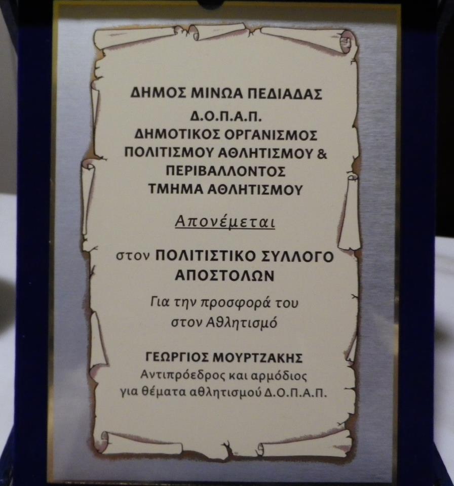 Βράβευση από το Δήμο Μινώα Πεδιάδος του Πολιτιστικού Συλλόγου για την προσφορά του.