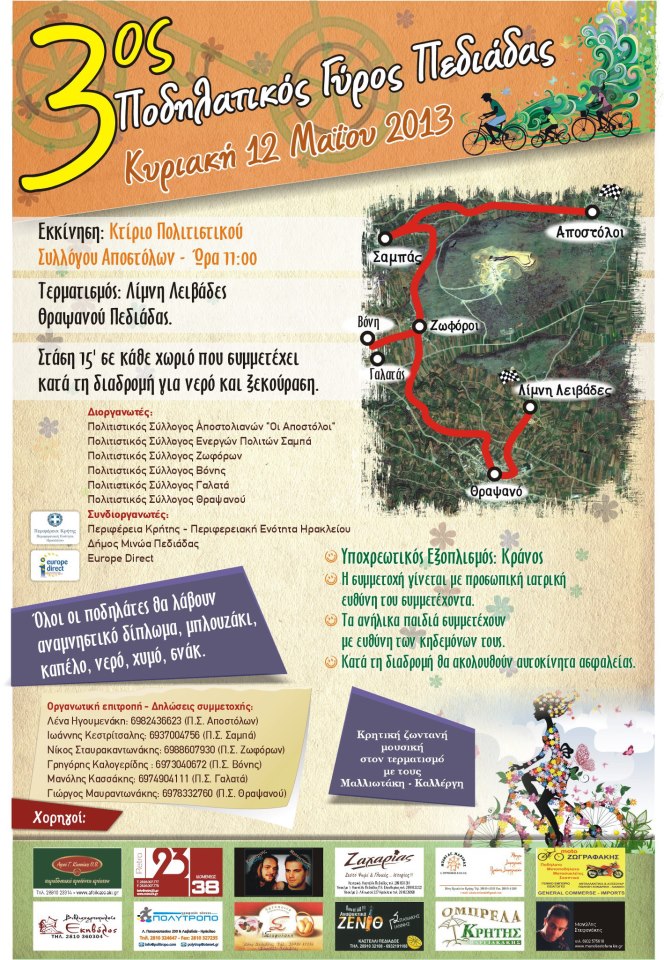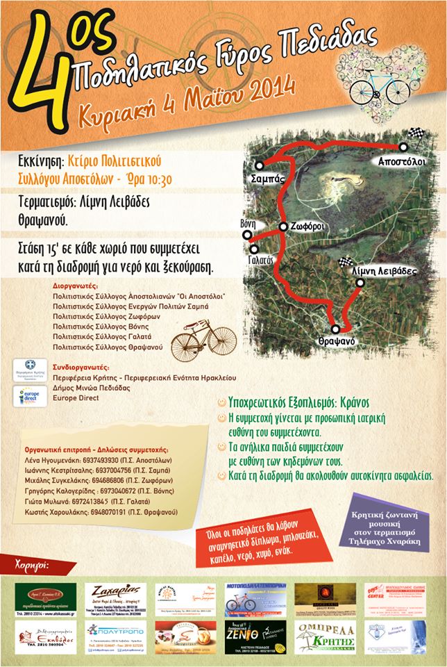 4ος ΠΟΔΗΛΑΤΙΚΟΣ ΓΥΡΟΣ ΠΕΔΙΔΑΔΑΣ 4-5-2014 Mε επιτυχία πραγματοποιήθηκε στις 4 Μαΐου του 2014 ο «4ος ΠΟΔΗΛΑΤΙΚΟΣ ΓΥΡΟΣ ΠΕΔΙΑΔΑΣ» που οργάνωσαν οι Πολιτιστικοί Σύλλογοι Αποστόλων, Σαμπά, Ζοφόρων,Βόνης,Γαλατά και Θραψανού. Θα θέλαμε να τονίσουμε ότι η πραγματοποίηση της εκδήλωσης δεν θα ήταν εφικτή χωρίς την συμβολή όλων.