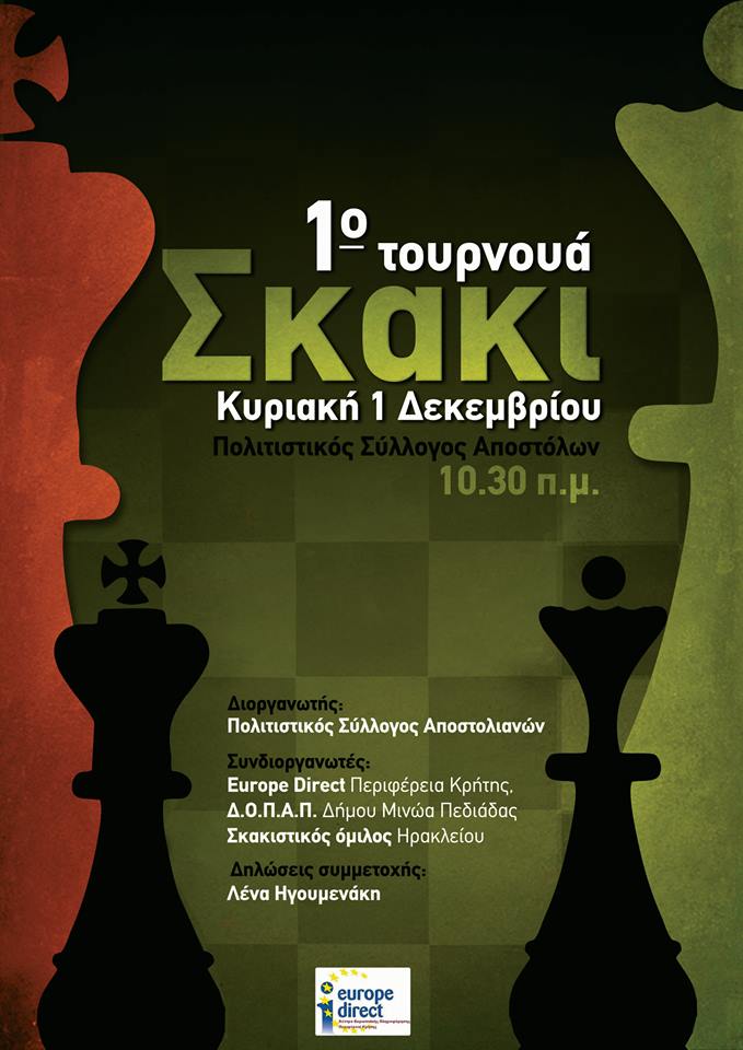 ΚΥΡΙΑΚΗ 1 ΔΕΚΕΜΒΡΙΟΥ 2013-1ο ΤΟΥΡΝΟΥΑ ΣΚΑΚΙ Τη Κυριακή 1 Δεκεμβρίου 2013 και ώρα 10:30 ο Πολιτιστικός Σύλλογος Αποστόλων διοργάνωσε με απόλυτη επιτυχία σε συνεργασία με την Περιφέρεια Κρήτης, το δήμο Μινώα Πεδιάδας και το Σκακιστικό Όμιλο Ηρακλείου το πρώτο Τουρνουά Σκάκι.(φωτο Ημέρας από Εφημερίδα ΠΑΤΡΙΣ) ΕΥΧΑΡΙΣΤΗΡΙΑ ΕΠΙΣΤΟΛΗ Ο Πολιτιστικός Σύλλογος Αποστολιανών και ο Σκακιστικός Όμιλος Ηρακλείου διεξήγαγαν την Κυριάκη 1 Δεκέμβριου 2013 το 1ο ΣΚΑΚΙΣΤΙΚΟ ΤΟΥΡΝΟΥΑ στους Αποστόλους Πεδιάδας. Η εκδήλωση σημείωσε τεράστια επιτυχία αφού λόγω της μεγάλης προσέλευσης και συμμετοχής παρατάθηκε ο χρόνος μέχρι της 16:00 μ.μ. Με το σύνθημα της εκκίνησης...ΚΑΘΕ ΜΕΡΑ ΚΑΛΥΤΕΡΟΙ... οι 64 σκακιστές, ενήλικες, παιδιά, ενεργοί σκακιστές και μη, δοκίμασαν τις γνώσεις και τις δυνάμεις τους!! Από πλευράς του Πολιτιστικού Συλλόγου θα θέλαμε να ευχαριστήσουμε... · Το Europe Direct της Περιφέρειας Κρήτης. · Τον Δήμο Μινώα Πεδιάδας . · Τον κύριο Νίκο Παπανδρέου από τον Σκακιστικό Όμιλο Ηρακλείου που μας προσφέρε απλόχερα την πολύτιμη βοήθεια του. · Τους μικρούς και μεγάλους σκακιστές που με τη συμμετοχή τους έδειξαν την αγάπη τους για το σκάκι και μας τίμησαν με την παρουσία τους. ...γιατι χωρίς όλους εσάς δεν θα μπορούσαμε σήμερα να είμαστε περήφανοι για την επιτυχία αυτής της εκδήλωσης! Το Δ.Σ. του Συλλόγου