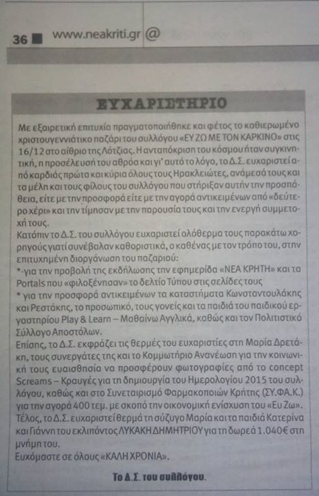 Συμμετοχή στο Χριστουγεννιάτικο παζάρι του Συλλόγου «Ευ Ζω με τον Καρκίνο», Τρίτη 16 Δεκεμβρίου 2014 Ο Πολιτιστικός σύλλογος συμμετείχε στο Χριστουγεννιάτικο παζάρι του Συλλόγου «Ευ Ζω με τον Καρκίνο» που πραγματοποιήθκε στο χώρο της Λότζια. Εμείς συνδράμαμε με τα αρωματικά σαπουνάκια... που με πολύ αγάπη κάναμε!