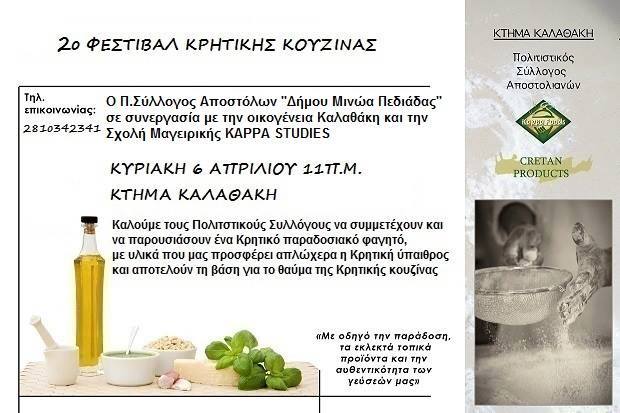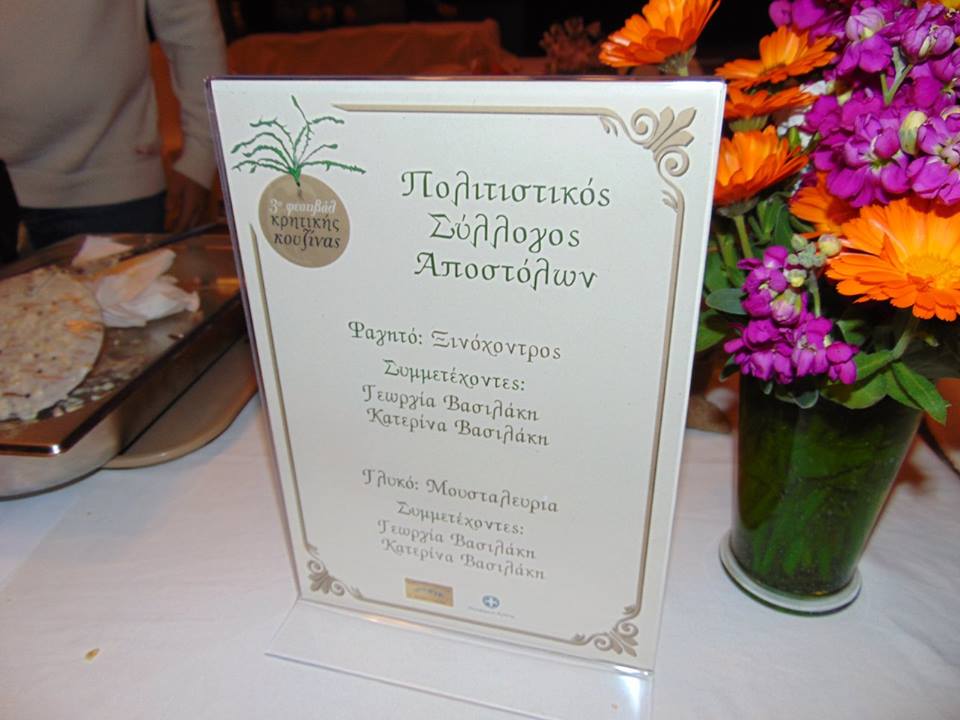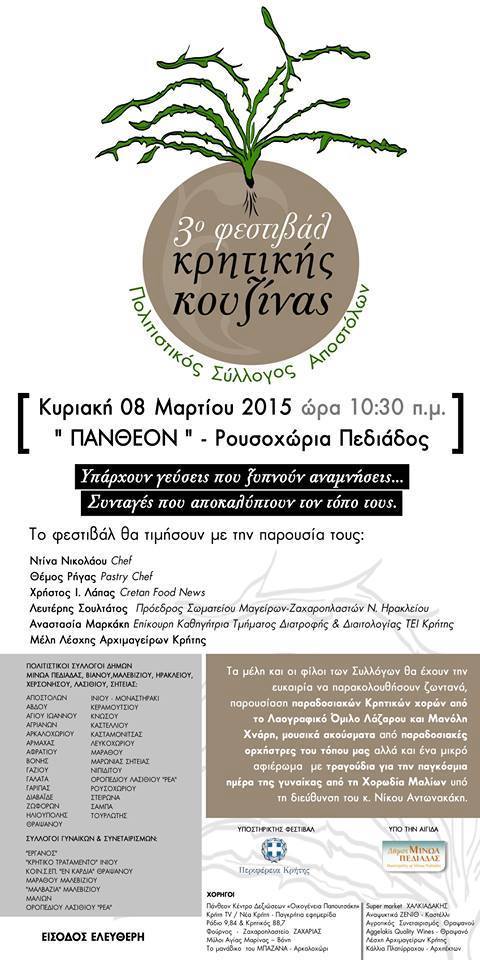 Οργάνωση του 3ου Φεστιβάλ Κρητικής Κουζίνας. Κυριακή 8-3-2015 Ο Πολιτιστικός Σύλλογος Αποστόλων διοργανώσε την Κυριακή 8 Μαρτίου, και ώρα 10:30 το πρωί, το 3ο Φεστιβάλ Κρητικής Κουζίνας στο "Πάνθεον" στα Ρουσσοχώρια Πεδιάδος. Το φεστιβάλ είχε απόλυτη επιτυχία με πολλούς πολιτιστικούς σύλλογος να συμμετέχουν. Σχετικές αναφορές απο Νέα Κρήτη, Φεστιβάλ Κρητικής Κουζίνας Ένα "περιβόλι" γεμάτο παραδόσεις είχε το 3ο Φεστιβάλ Κρητικής Κουζίνας... ήθη, έθιμα, τραγούδια,χορούς, γεύσεις, χρώματα.Ενωμένοι με αγάπη για τον τόπο μας Πολιτιστικοί Σύλλογοι από όλη την Κρήτη μαγείρεψαν και ξύπνησαν μυρωδιές θύμησης στο 3ο Φεστιβάλ Κρητικής Κουζίνας στο κέντρο "Πάνθεον" στα Ρουσσοχώρια του δήμου Μινώα Πεδιάδος την Κυριακή 8 Μαρτίου 2015. Ενα φεστιβάλ που ξεπέρασε κάθε προσ δοκία, αφού περισσότεροι απο 3.000 άνθρωποι επισκέφτηκαν τον χώρο και γεύτηκαν μυρωδιές της παραδοσιακής κρητικής κουζίνας και τη φιλοξενία που ξέρει πάντα να παρέχει απλόχερα μια Κρητική οικογένεια! Θα θέλαμε να σας ευχαριστήσουμε όλους το ίδιο,γιατί όλοι μαζί κρίκοι σε μια αλυσίδα βάλατε μια πινελιά, η μάλλον την αγάπη σας ,την καθαρή ψυχη σας,το μεράκι σας, το χαμόγελο σας...! Σας ευχαριστούμε πολύ όλους από καρδιάς και καλή αντάμωση συναγωνιστές το πολιτισμού! Με εκτίμηση...το Δ.Σ.του Πολιτιστικού Συλλόγου Αποστόλων