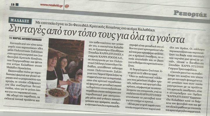 1ο ΦΕΣΤΙΒΑΛ ΟΙΚΙΑΚΗΣ- ΚΑΘΗΜΕΡΙΝΗΣ ΚΡΗΤΙΚΗΣ ΚΟΥΖΙΝΑΣ ΚΥΡΙΑΚΗ 7 ΑΠΡΙΛΙΟΥ 2013 Ο ΠΟΛΙΤΙΣΤΙΚΟΣ ΣΥΛΛΟΓΟΣ ΑΠΟΣΤΟΛΩΝ σε συνεργασία με το Εργαστήρι Μαγειρικής KAPPA STUDIES, την εταιρία catering KAPPA FOODS A.E. και τoν ΘΕΟΔΩΡΟ ΚΑΛΑΘΑΚΗ, διοργανώσαν με απόλυτη επιτυχία την Κυριακή 7 Απριλίου 2013 στο ΚΤΗΜΑ ΚΑΛΑΘΑΚΗ στις Μαλάδες το 1ο Φεστιβάλ Οικιακής - Καθημερινής Κρητικής Κουζίνας, με οδηγό την παράδοση, τα εκλεκτά τοπικά προϊόντα και την αυθεντικότητα των γεύσεών μας. Ευχαριστήρια Επιστολή Η παρουσία σας στο 1ο ΦΕΣΤΙΒΑΛ ΟΙΚΙΑΚΗΣ- ΚΑΘΗΜΕΡΙΝΗΣ ΚΡΗΤΙΚΗΣ ΚΟΥΖΙΝΑΣ μας έδωσε μεγάλη χαρά γι' αυτό σας ευχαριστούμε πολύ. Θέλουμε να πούμε ένα μεγάλο ευχαριστώ στον κύριο Θεόδωρο Καλαθάκη και την οικογένεια του που σήμερα μας φιλοξένησαν στο κτήμα Καλαθάκη, και με αγάπη επιμεληθήκαν την οργάνωση της εκδήλωσης, αψηφώντας τη δύσκολη οικονομική περίοδο που βιώνουμε, προσφεροντάς μας, μια υποτροφία σπουδών των Σχολών Kappa Studies. O Π.Σ. Αποστόλων θέλει δημόσια να ευχαριστήσει τον κύριο Θεόδωρο Καλαθάκη για την άψογη συνεργασία μας και να πούμε ότι είναι σπάνιος άνθρωπος και σωστός επαγγελματίας. Θέλουμε από καρδιάς να ευχαριστήσουμε: 1. Τ ους πολιτιστικούς συλλόγους του δήμου Μινώα Πεδιάδας που δέχτηκαν την πρόσκλησή μας και σήμερα ήταν κοντά μας. 2. Τ ις κυρίες και τους κυρίους που μαγείρεψαν για το 1ο ΦΕΣΤΙΒΑΛ ΟΙΚΙΑΚΗΣ- ΚΑΘΗΜΕΡΙΝΗΣ ΚΡΗΤΙΚΗΣ ΚΟΥΖΙΝΑΣ και μέσα από την εικόνα, τη γεύση και τις μυρωδιές, μας θύμισαν ότι η Κρητική κουζίνα είναι μοναδική στο είδος της, γιατί χρησιμοποιεί υλικά και πρώτες ύλες από την Κρητική ύπαιθρο. ΣΥΛΛΟΓΟΙ- ΠΑΡΑΣΚΕΥΕΣ- ΑΤΟΜΑ Π.Σ. Αποστόλων Σκιουφιχτά - Μαγγίρι - Φασολάκια Μαυρομάτικα Σαλάτα, Γεωργία Βασιλάκη - Χριστίνα Πετροδασκαλάκη - Χαρούλα Μαραγκάκη Π.Σ. Αυλής Χοχλιούς με Χόντρο, Μαίρη Πλαιτάκη-Γίαννης Μπαστουνάκης Π.Σ. Βόνης Χοιρομέρι Γιαχνί, Βαγγέλης Στρατάκης Π.Σ. Γαλατά Καπρικό, Στάθης Λαδομένος - Γιάννης Μανουσάκης Π.Σ. Γαρύπας Σαλιαρίσματα από την Μάνα Γη (Πατάτες με χοχλιούς), Διαμαντούλα Απλατανάκη-Μαρία Μπελεγρίνου -Χαρούλα Χατζιαντωνίου- Χαράλαμπος Μαράκης -Μάγδα Χαραλαμπάκη Π.Σ.Γερακίου Μυζηθρόπιτες,Παρασκευή Γκιαουράκη Π.Σ. Ζωφόρων Δροσερά Κουκιά με Χοχλιούς, Μαρία Σταυρακαντωνάκη - Μαρία Συγγελάκη Π.Σ. Θραψανού Μπίζα Γιαχνί με Μάραθα - Κουκιά Ξερά Γιαχνί με Πατάτες, Βάσω Μαυραντωνάκη-Κατερίνα Αραβιάκη Π.Σ.Κασταμονίτσας Εφτάζυμο, Άννα Ανδριανάκη Π.Σ. Λευκοχωρίου Χοχλιούς με Πλιγούρι,Ελευθερία Μαραγκάκη Π.Σ. Πολυθέας Ομελέτα Απάκι - Μυζήθρα Τηγανιτή με Μέλι, Δημήτρης Λυδάκης - Κατερία Παγωνάκη Π.Σ. Ρουσοχωρίου Χοχλιούς Γιαχνί, Μαριάνθη Βλαστού - Μαρία Ζαργάκη Π.Σ. Σαμπά Κουκιά Στιφάδο, Δέσποινα Περάκη - Κατερίνα Περάκη Π.Σ. Σμαρίου Αρνί με Αγριαγκινάρες - Χοιρινό με Γιαχνερά, Μαρίνα Μηλαθιανάκη Π.Σ.Τουρλωτής Σουπιές με Μάραθα-Πορτοκαλοπίτα, Δέσποινα Τζανακάκη- Μιχάλης Παπακωσταντής Ευχαριστούμε τους παραγωγούς μας, που με αγάπη προσέφεραν τα προϊόντα τους. · Παραδοσιακά Προϊόντα Κρέατος - Αφοι Γ. ΚασσάκηΟ.Ε. - Γαλατάς · Προϊόντα Βιολογικής Γεωργίας - Ηγουμενάκης Μανώλης - Αποστόλοι · Μύλοι Αγ. Μαρίνας -Στεφανάκης Αντώνης & ΣΙΑΟ.Ε- Βόνη · Αγροτικός Συνεταιρισμός Θραψανού - Θραψανό · Αυγοφρέσκο - Περάκη Κατερίνα -Ηράκλειο · Αρτοποιείο - Ζαχαροπλαστείο Ζαχαρίας - Καστέλλι- Ηράκλειο · Κρητικό Μέλι - Οικογένεια Παπαγιάννακη -Αποστόλοι · Κρητικό Μέλι - Μουστακάκης Γιώργος - Πολυθέα · Κρητικό Μέλι - Διακενησάκης Γιάννης - Πολυθέα · Παραγωγοί Πα