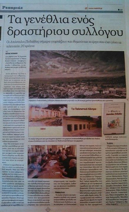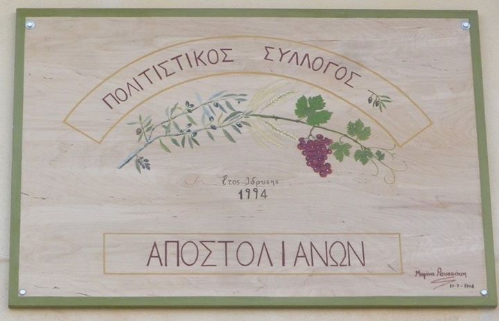 ΕΚΔΗΛΩΣΗ ΓΙΑ ΤΑ 20 ΧΡΟΝΙΑ ΑΠΟ ΤΗΝ ΙΔΡΥΣΗ ΤΟΥ ΣΥΛΛΟΓΟΥ 21-7-2014Τη Δευτέρα 21 Ιουλίου ο Πολιτιστικός Σύλλογος Αποστολιανών γιόρτασε τα 20 χρόνια προσπάθειας για ανάπτυξη. Στην παρέα των Αποστολιανών βρισκόταν αξιόλογοι μουσικοί καλλιτέχνες και χορευτές, τους οποίους ευχαριστούμε. ( Αντώνης Μαλιωτάκης, Νεκτάριος Σαμόλης,Βασίλης Δαμιανάκης, Ιάκωβος Πατεράκης, Μιχάλης Αλεφαντινός Βασίλης Καλομοίρης, Μάρω Καλογεράκη,Κωστής Διακαινισάκης,Νίκος Ζουραράκης, Αρτέμη Καλογερίδη, Μανόλης Καλογερίδης και ο Λαογραφικός Όμιλος "Λάζαρος κ Μανόλης Χνάρης")