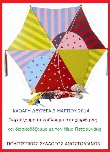 Κ. Δευτέρα 18-3-2013 Tη Καθαρά Δευτέρα 18-3-2013 γιορτάσουμε τα Κούλουμα παρέα,όπως κάθε χρόνο,στο χωριού μας.Την εκδήλωση πλαισιώσε μουσικά ο Νίκος Πετρουγάκης με το συγκρότημά του, ενώ οι συγχωριανοί έφτιαξαν και προσέφεραν αρκετές νηστίσημες λιχουδιές. Το κέφι ήταν π'αρα πολύ και ο χορός κράτησε μέχρι το βράδυ. Σας ευχαριστούμε όλους για τη συμμετοχή σας, ευχαριστούμε όλους όσους βοήθησαν και αυτή τη φορά για να έχουμε άλλη μια πετυχημένη εκδήλωση.