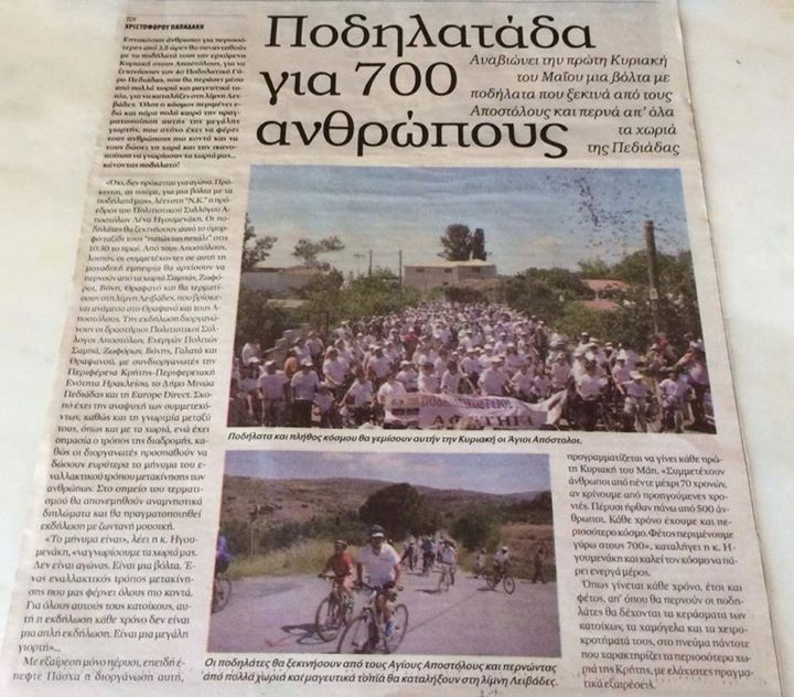 Τετάρτη 15-5-2013 Μαστογραφία H Κινητή Μονάδα Μαστογραφίας της Περιφέρειας Κρήτης σε συνεργασία με τον Πολιτιστικό Σύλλογο Αποστόλων βρισκόταν στο Χωριό μας, την Τετάρτη 15/5/2013 και από ώρα 9.00' μεχρι 2.00' με σκοπό την εξυπηρέτηση των γυναικών του χωριού μας, που ήθελαν να πραγματοποιήσουν εξέταση μαστογραφίας. Κυριακή 12-5-2013 3oς Ποδηλατικός Γύρος Πεδιάδας Με επιτυχία πραγματοποιήθηκε στις 12 Μαΐου του 2013 ο «3ος ΠΟΔΗΛΑΤΙΚΟΣ ΓΥΡΟΣ ΠΕΔΙΑΔΑΣ» που οργάνωσαν οι Πολιτιστικοί Σύλλογοι Αποστόλων, Σαμπά, Ζοφόρων,Βόνης,Γαλατά και Θραψανού. Θα θέλαμε να τονίσουμε ότι η πραγματοποίηση της εκδήλωσης δεν θα ήταν εφικτή χωρίς την συμβολή όλων. Ανανεώνουμε το ραντεβού μας για το Μάιο του 2014 στον «4ο ΠΟΔΗΛΑΤΙΚΟ ΓΥΡΟ ΠΕΔΙΑΔΑΣ»