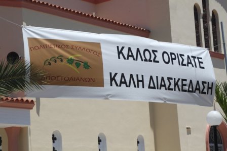 Εορτή Αγ.Αποστόλων-Κρητικό Γλέντι Σάββατο 29-6-2013 Ο Πολιτιστικός Σύλλογος Αποστολιανών για τον εορτασμό των Αγίων Αποστόλων διοργάνωσε και φέτος με απόλυτη επιτυχία το ετήσιο γλέντι του χωριού μας, που έγινε το Σάββατο 29-6-2013 . Την βραδιά πλαισίωσαν μουσικά οι Σταυρακάκης Βασίλης, Σταυρακάκης Αντώνης, Πατεράκης Ιάκωβος και το συγκρότημα τους. Επίσης έγινε βράβευση των επιτυχόντων για το έτος 2012, στα Ανώτατα και Ανώτερα Εκπαιδευτικά Ιδρύματα.