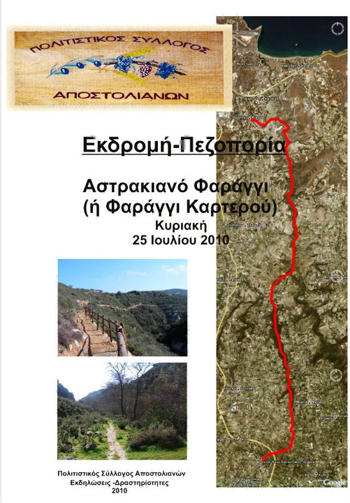 ΕΚΔΡΟΜΗ-ΠΕΖΟΠΟΡΙΑ ΣΤΟ ΑΣΤΡΑΚΙΑΝΟ ΦΑΡΑΓΓΙ Τη Κυριακή 25 Ιουλίου 2010 πραγματοποιήθηκε εκδρομή-πεζοπορία στο Αστρακιανό φαράγγι (Καρτερού). Στο τέλος καταλήξαμε στη παραλία Καρτερού για μια δροσερή βουτιά. Το Αστρακιανό φαράγγι ( ή φαράγγι του Καρτερού) αποτελεί τμήμα ενός ευρύτερου γεωλογικού συμπλέγματος που αποτελείται από τα φαράγγια «Κουνάβων- Αστρακών -Καρτερού», μήκους 21,5 χλμ. περίπου . Είναι το εκτενεστερο της περιοχής, μήκους 12,5χλμ. περίπου. Ξεκινά βορειοδυτικά από τη θέση Κολομόδι και διατρέχει την περιοχή Αστρακών (Δήμου Ν.Καζαντζάκη), τις πηγές Μηλιαρά και τα όρια της κτηματικής περιφέρειας Καρτερού, σε μια διαδρομή πλούσια σε φυσικά, μορφολογικά και πολιτιστικά χαρακτηριστικά. Έχουν εντοπιστεί θέσεις ιστορικής και πολιτισμικής αξίας όπως η αρχαία Έλτυνα, ο μινωικός οικισμός Μυρτιάς και το μινωικό νεκροταφείο Αστράκων. Η χλωρίδα των φαραγγιών περιλαμβάνει υδρόφιλα είδη όπως πλατάνια, ιτιές και λυγαριές καθώς και πολλά ενδημικά της Ελλάδας ή της Κρήτης. Όσο για την πανίδα της, περιλαμβάνει περισσότερα από 44 είδη πουλιών και 7 είδη θηλαστικών.